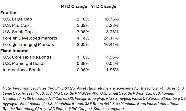 August delivered another month of positive returns across most major asset classes, with equities leading the way as investors positioned for a potential shift in monetary policy. Despite ongoing trade tensions and a mixed economic backdrop, markets rallied on rising expectations of Federal Reserve rate cuts and signs of easing global tariff pressures.